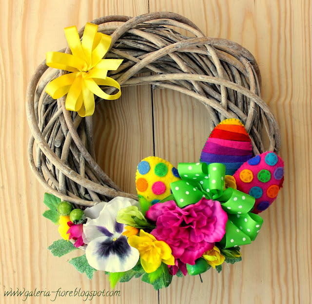 Asymetryczny wianek z piękną kompozycją kolorowych kwiatów. Wykonany na podkładzie z gałązek bielonych, na którym kolorowe elementy są świetnie wyeksponowane. Wśród kwiatów znajduje się soczyście zielona kokarda w białe groszki, po jej przeciwnej stronie - podobna w kolorze żółtym. Zza kwiatów wystają trzy kolorowe ręcznie uszyte, filcowe pisanki: dwie w kolorowe kropy, trzecia w tęczowe paski. Filcowe pisanki wykonane zostały przez Asię, której prace można obejrzeć na blogu http://asia-majstruje.blogspot.com/